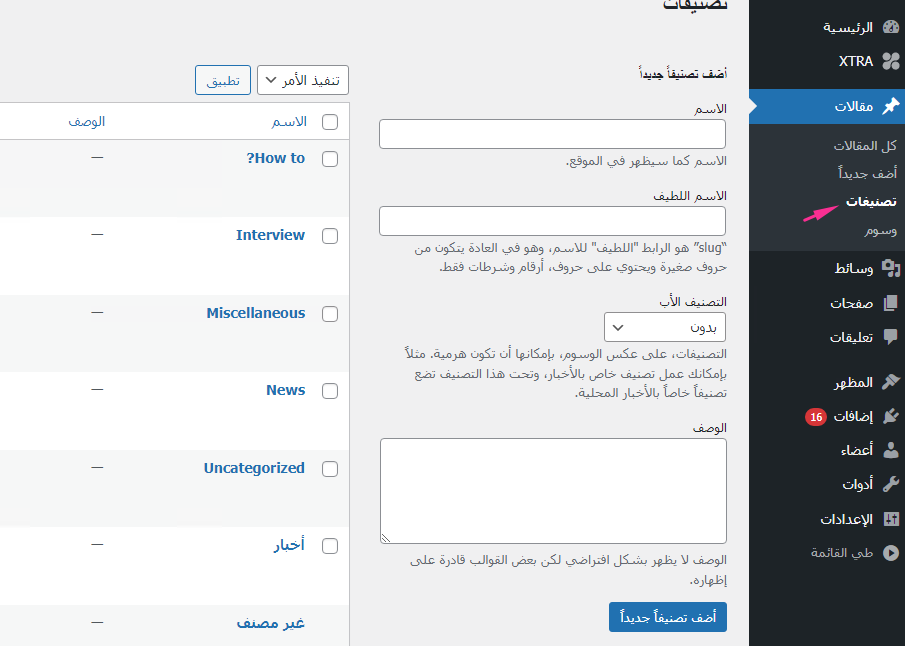 بالذهاب والتوجه الي مقالات ثم تصنيفات ثم بالنقر عليها سيظهر امكانية انشاء تصنيف او قسم جديد داخل الووردبريس بشكل تلقائي