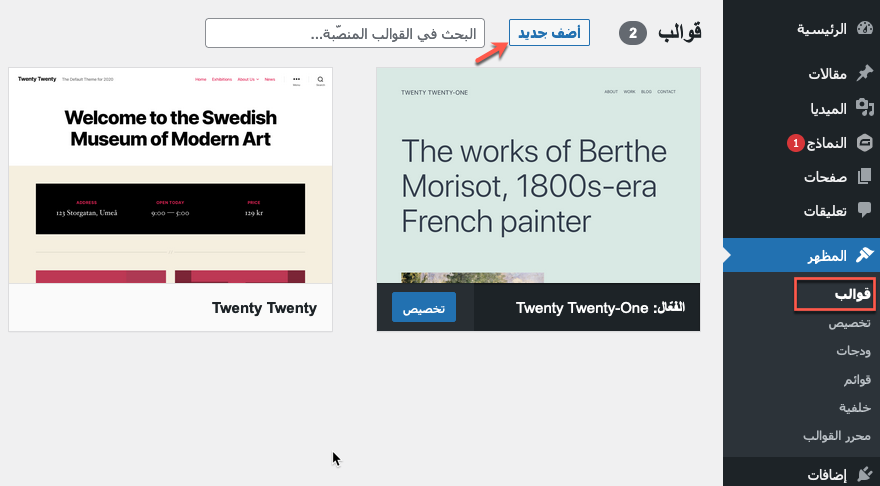 “ليتم عرض جميع القوالب المنصبة والمرفوعة ليمكن منها تفعيل المطلوب او يمكن رفع قالب جديد من خلال النقر علي ايقون “أضف جديد